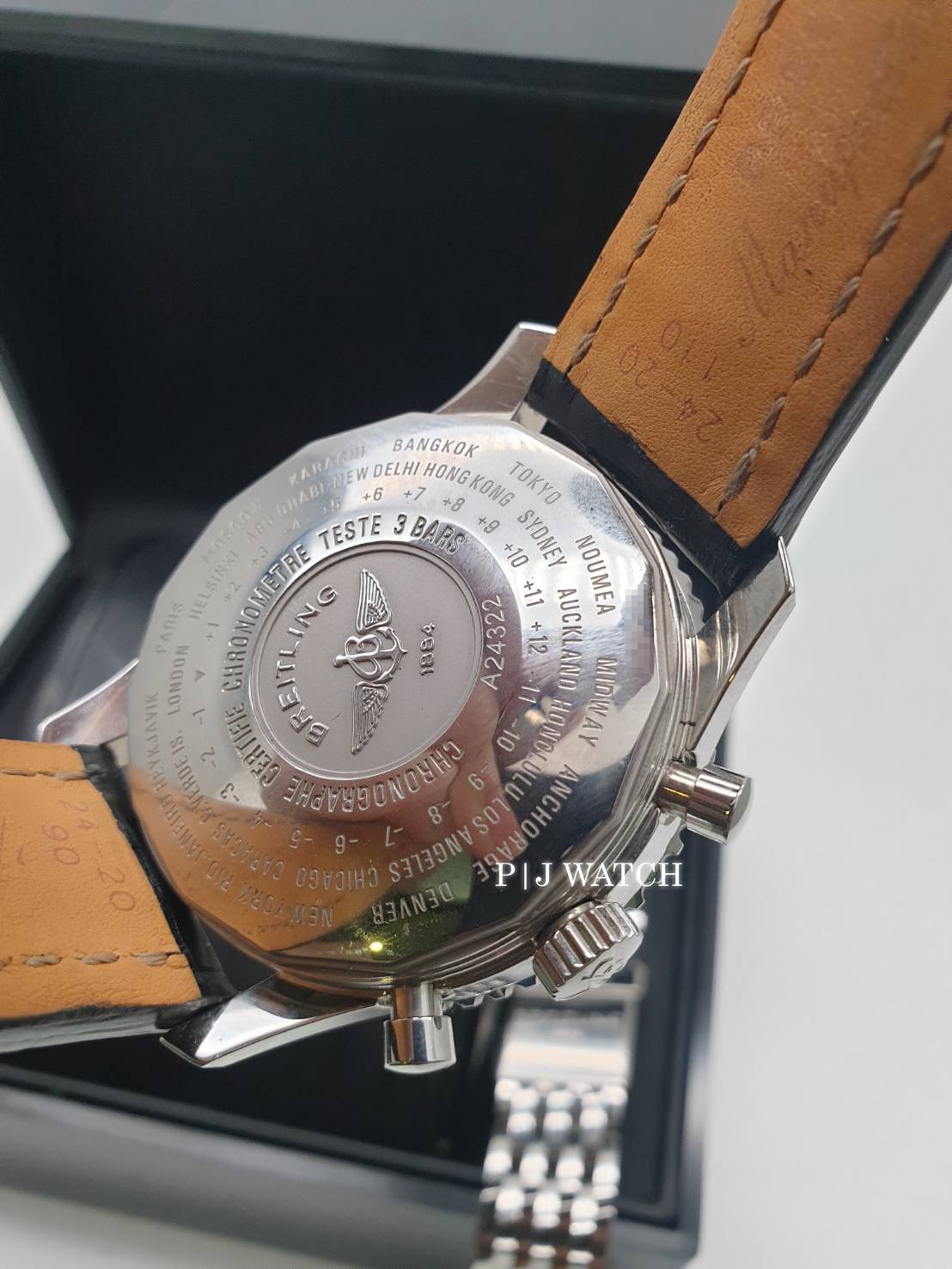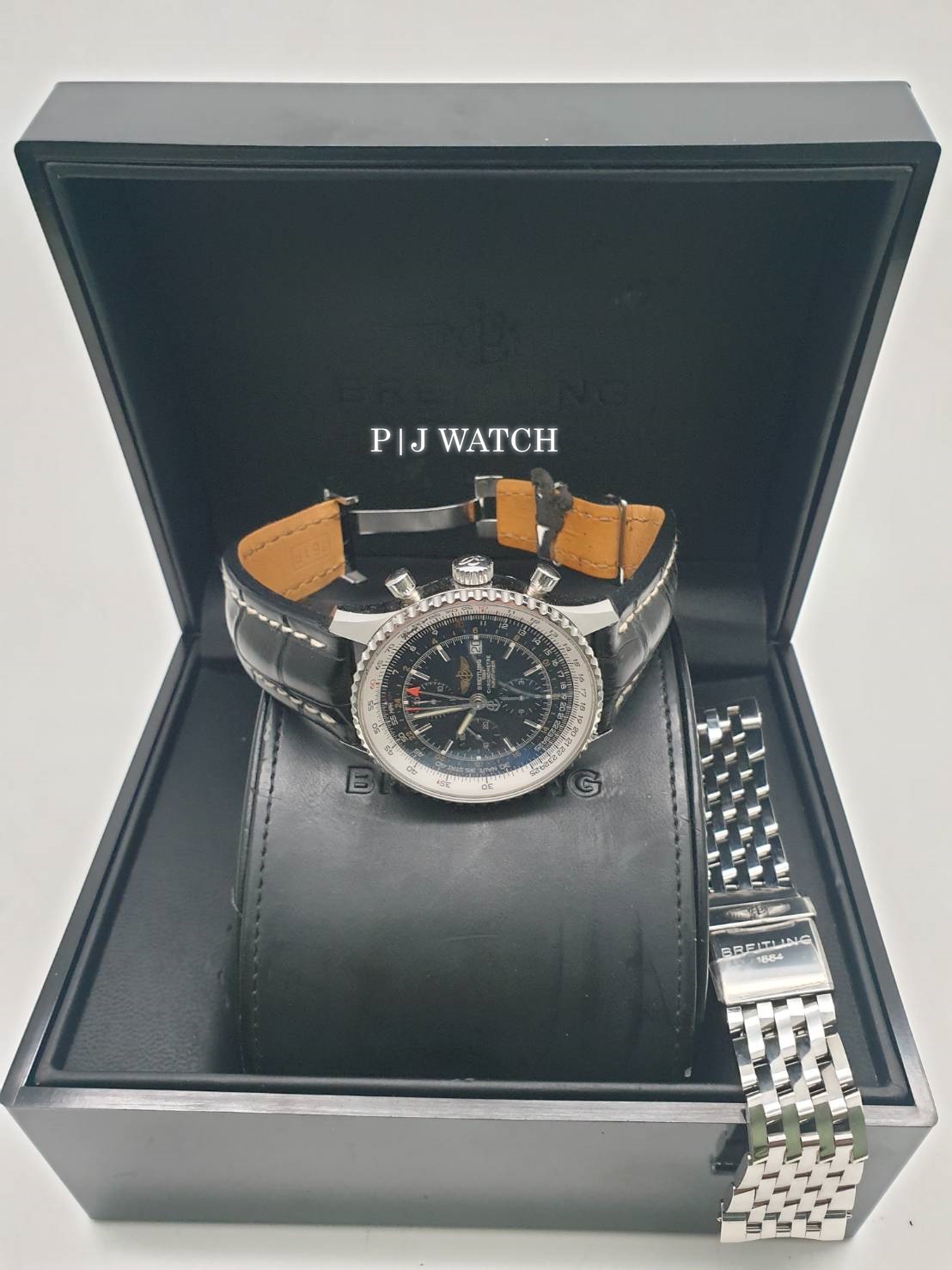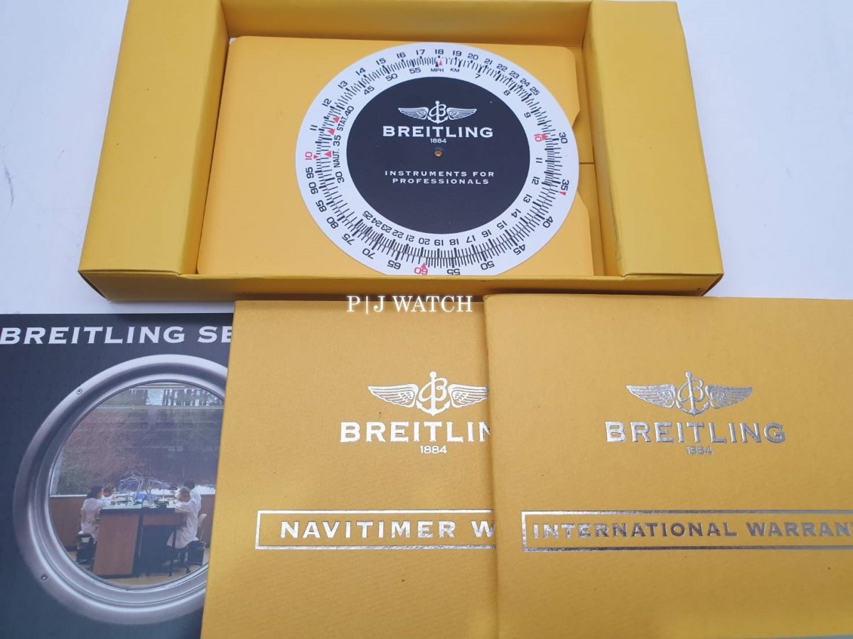 ขอแนะนำ นาฬิกาแบรนด์ Breitling 1884 Chronometre Navitimer World Ref. A24322 เป็นนาฬิกาจับเวลาแบบ Chronograph ให้รายละเอียดให้เยอะสุดๆ โครโนกราฟขอบหน้าปัดหมุนได้สองทิศทางโซนเวลาสองโซนพร้อมจอแสดงผล 24 ชั่วโมง บนหน้าปัดสีดำ ส่วนมาร์คเกอร์หลักชั่วโมงเป็นแบบขีดสีเงินมีพรายน้ำแบบจุดสี่เหลี่ยมบนหัวมาร์คเกอร์อีกที มีหน้าต่างบอกวันที่ตรงตำแหน่ง 3 นาฬิกา และหน้าต่างย่อย 3 หน้าต่าง ของฟังก์ชั่น Chronograph ส่วนเข็มบอกเวลาชั่วโมง นาที สีเงินทรงดาบพร้อมพรายน้ำ และเข็มวินาทีสีเงินปลายสีส้ม ส่วนเข็ม GMT เป็นสีเงินหัวสามเหลี่ยมสีส้ม ครอบทับด้วยกระจก Sapphire ป้องกันรอยขีดข่วน ส่วนตัวเคสเป็นสแตนเลสปัดเงาขนาดอยู่ที่ 46มม. หนาอยู่ที่ 7.6มม ตัวเครื่องเป็นนาฬิกา Automatic เครื่อง Breitling Cal.24 ให้พลังงานสำรองอยู่ที่ 42 ชั่วโมง กันน้ำได้อยู่ที่ 3 บาร์ หรือ 30 เมตร มาพร้อมกับสายหนังจระเข้สีดำเดินด้ายสีขาว และ Buckle แบบบานพับ ของแถมมีกล่อง คู่มือ และสายสแตนเลสสายเดิมของเรือนนี้มาให้ด้วย และหนังสือบรับรองมาให้ครบๆ แบบ Full Set เลยครับ สภาพตามการใช้งานถือว่ายังอยู่ในสภาพที่ดีมากครับ ไม่เคยผ่านกันขัดแต่งแต่อย่างใด ท่านใดสนใจติดต่อสอบถามเข้ามาได้เลยครับผม