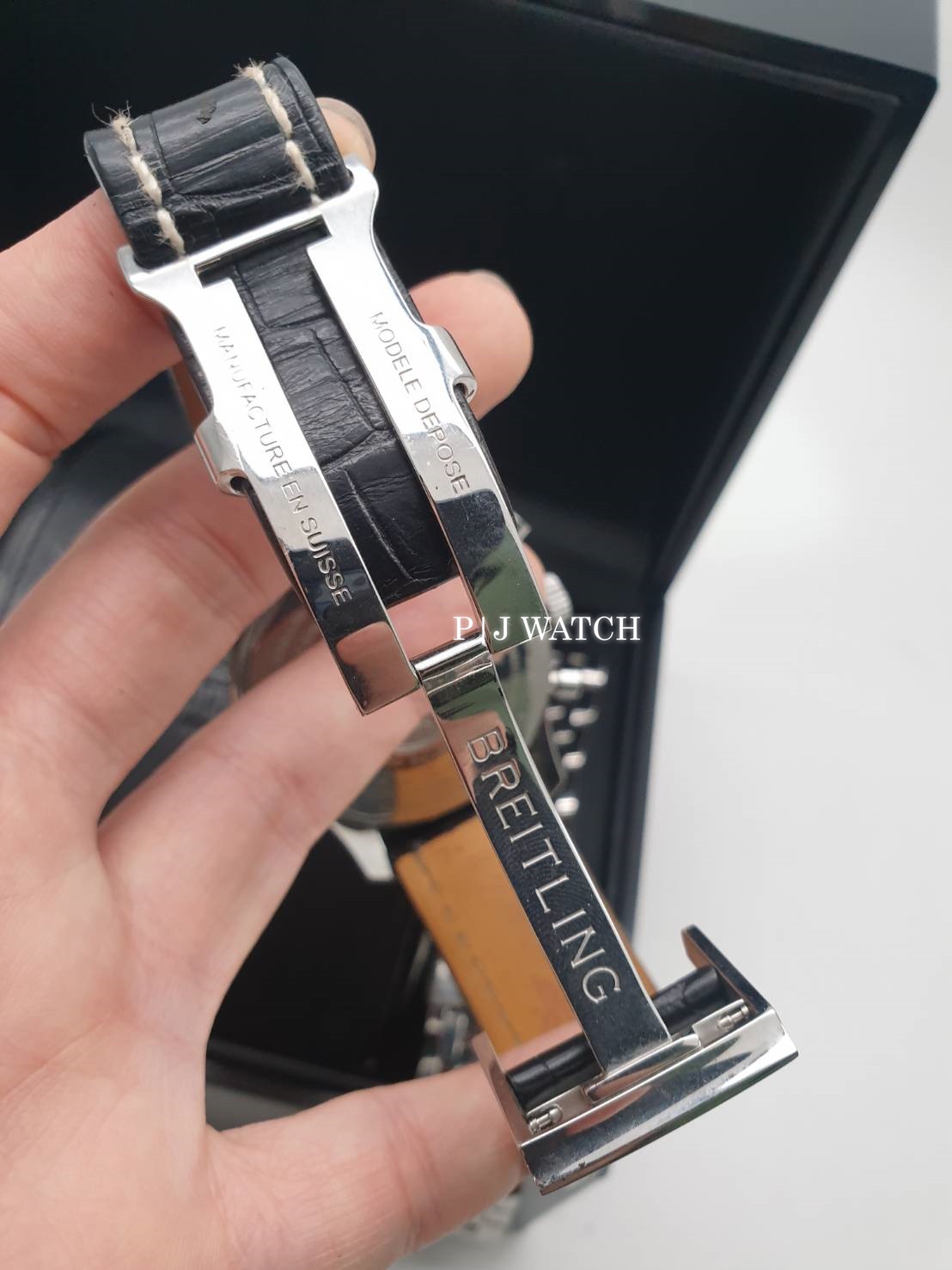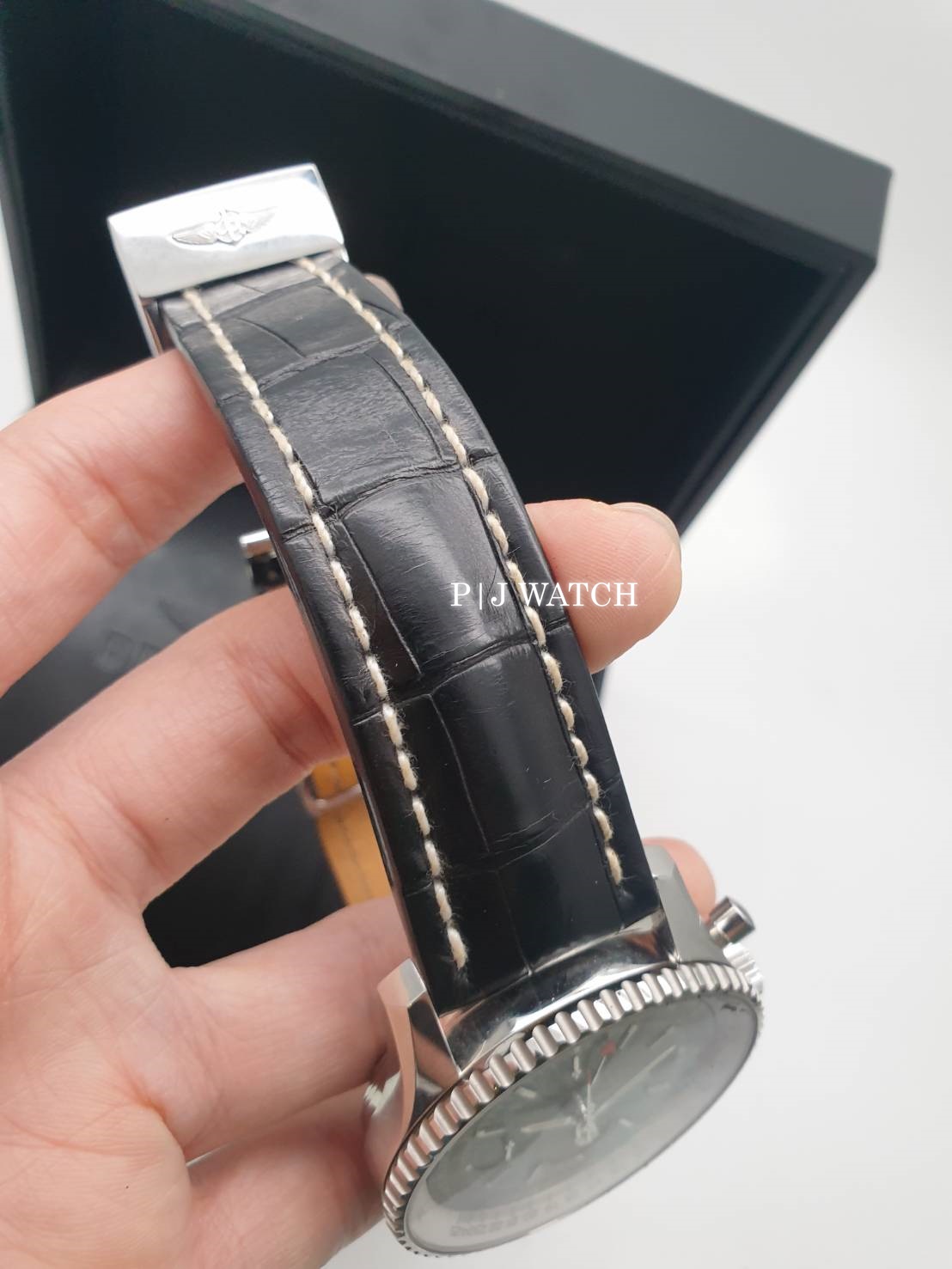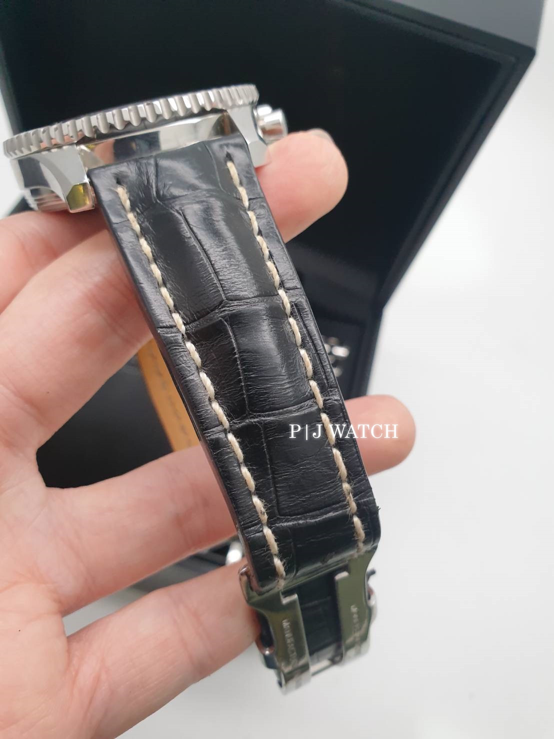 ขอแนะนำ นาฬิกาแบรนด์ Breitling 1884 Chronometre Navitimer World Ref. A24322 เป็นนาฬิกาจับเวลาแบบ Chronograph ให้รายละเอียดให้เยอะสุดๆ โครโนกราฟขอบหน้าปัดหมุนได้สองทิศทางโซนเวลาสองโซนพร้อมจอแสดงผล 24 ชั่วโมง บนหน้าปัดสีดำ ส่วนมาร์คเกอร์หลักชั่วโมงเป็นแบบขีดสีเงินมีพรายน้ำแบบจุดสี่เหลี่ยมบนหัวมาร์คเกอร์อีกที มีหน้าต่างบอกวันที่ตรงตำแหน่ง 3 นาฬิกา และหน้าต่างย่อย 3 หน้าต่าง ของฟังก์ชั่น Chronograph ส่วนเข็มบอกเวลาชั่วโมง นาที สีเงินทรงดาบพร้อมพรายน้ำ และเข็มวินาทีสีเงินปลายสีส้ม ส่วนเข็ม GMT เป็นสีเงินหัวสามเหลี่ยมสีส้ม ครอบทับด้วยกระจก Sapphire ป้องกันรอยขีดข่วน ส่วนตัวเคสเป็นสแตนเลสปัดเงาขนาดอยู่ที่ 46มม. หนาอยู่ที่ 7.6มม ตัวเครื่องเป็นนาฬิกา Automatic เครื่อง Breitling Cal.24 ให้พลังงานสำรองอยู่ที่ 42 ชั่วโมง กันน้ำได้อยู่ที่ 3 บาร์ หรือ 30 เมตร มาพร้อมกับสายหนังจระเข้สีดำเดินด้ายสีขาว และ Buckle แบบบานพับ ของแถมมีกล่อง คู่มือ และสายสแตนเลสสายเดิมของเรือนนี้มาให้ด้วย และหนังสือบรับรองมาให้ครบๆ แบบ Full Set เลยครับ สภาพตามการใช้งานถือว่ายังอยู่ในสภาพที่ดีมากครับ ไม่เคยผ่านกันขัดแต่งแต่อย่างใด ท่านใดสนใจติดต่อสอบถามเข้ามาได้เลยครับผม
