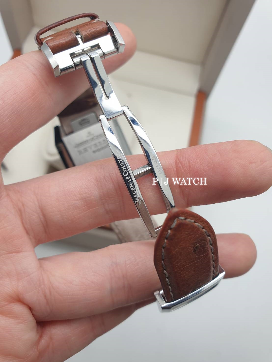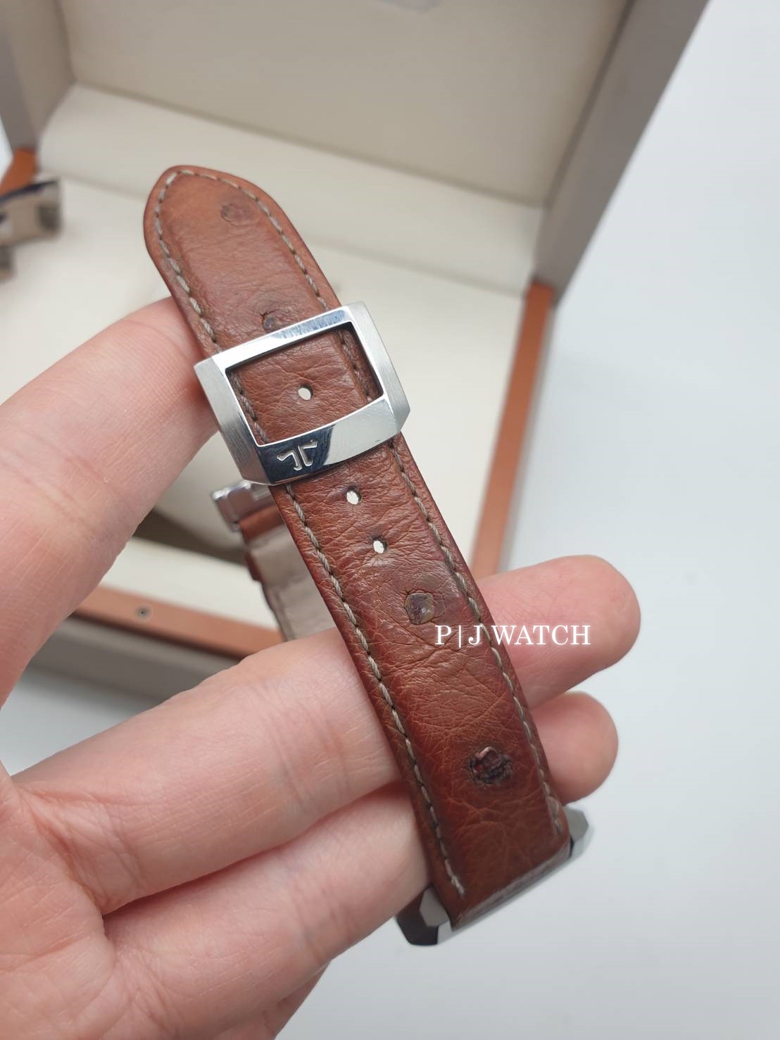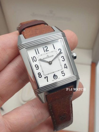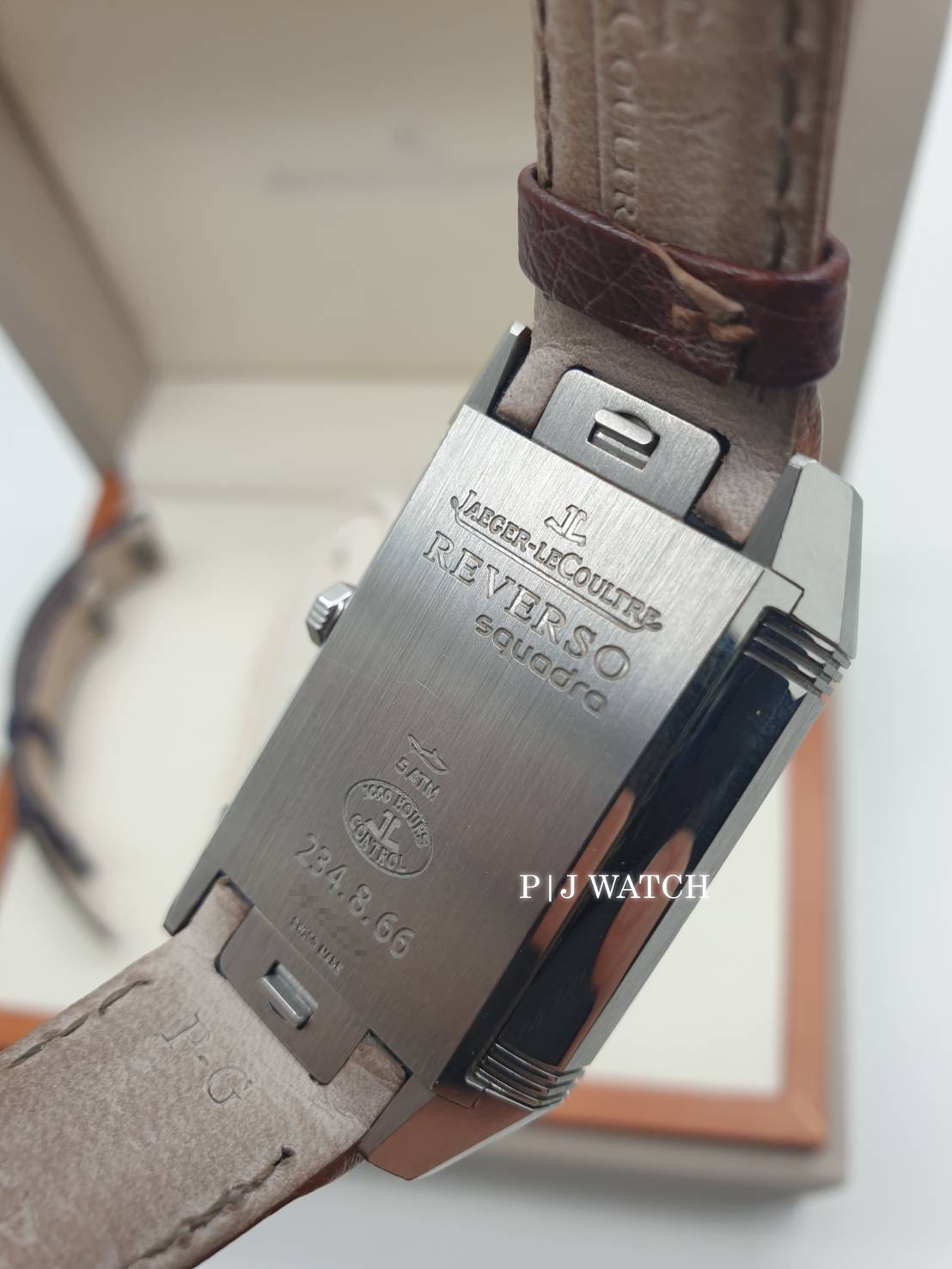 นาฬิกาแบรนด์ Jaeger-LeCoultre หรือ JLC มาในรุ่น Reverso Squadra Ref.234.8.66 เรือนนี้โดนเด่นด้วยการออกแบบเฉพาะของ JLC คือตัวเรือน สามารถเลื่อนสไลด์ไปด้านข้างแล้วพับให้โชว์เคสด้านหลังที่โชว์กลไกได้ หน้าปัดสีเงินขาว ตรงกลางเป็นลายหยักแนวนอน Fluted รูปสี่เหลี่ยมและขอบของลายหยักแสดงขีดของนาที หลักชั่วโมงเป็นเลขอารบิก และแสดงวันที่ตรงหัวของเลข 6 ตัวเคสวัสดุทำจากสแตนเลสสตีลมีขนาดสี่เหลี่ยมอยู่ที่ 28 x 42 มม. ความหนา 10 มม. กระจกใช้คริสตัลแซฟไฟร์กันรอยขีดข่วนได้เป็นอย่างดี ส่วนกลไกเป็น calibre JLC automatic 966 สายเป็นหนังสีน้ำตาล Buckle เป็น Jaeger LeCoultre flip clasp และแถมสายหนังจระเข้สีดำมาให้อีก 1 ชุดครับ มีกล่อง คู่มือ และใบรับรองมาให้ครับ สภาพสวยมากครับเรือนนี้ ท่านใดสนใจ สามารถสอบถามเข้ามาได้ครับ เรายินดีให้บริการทุกท่านครับผม