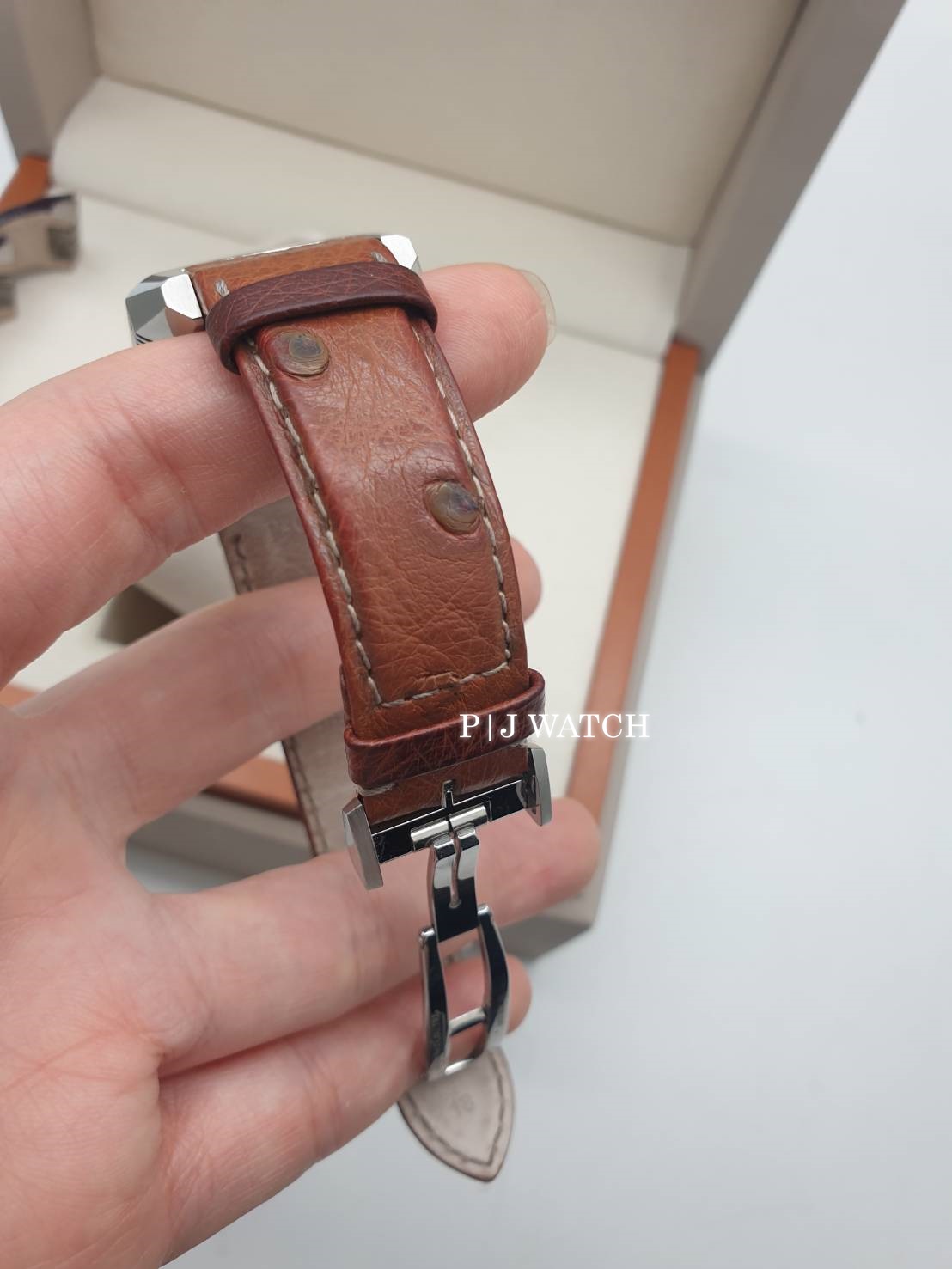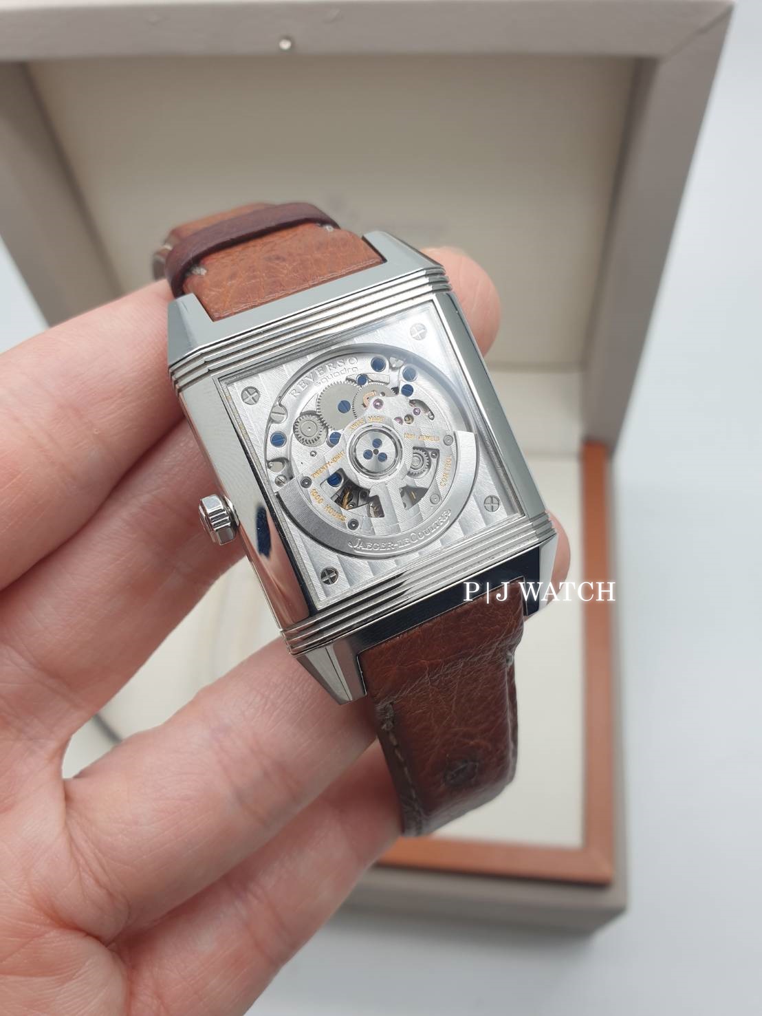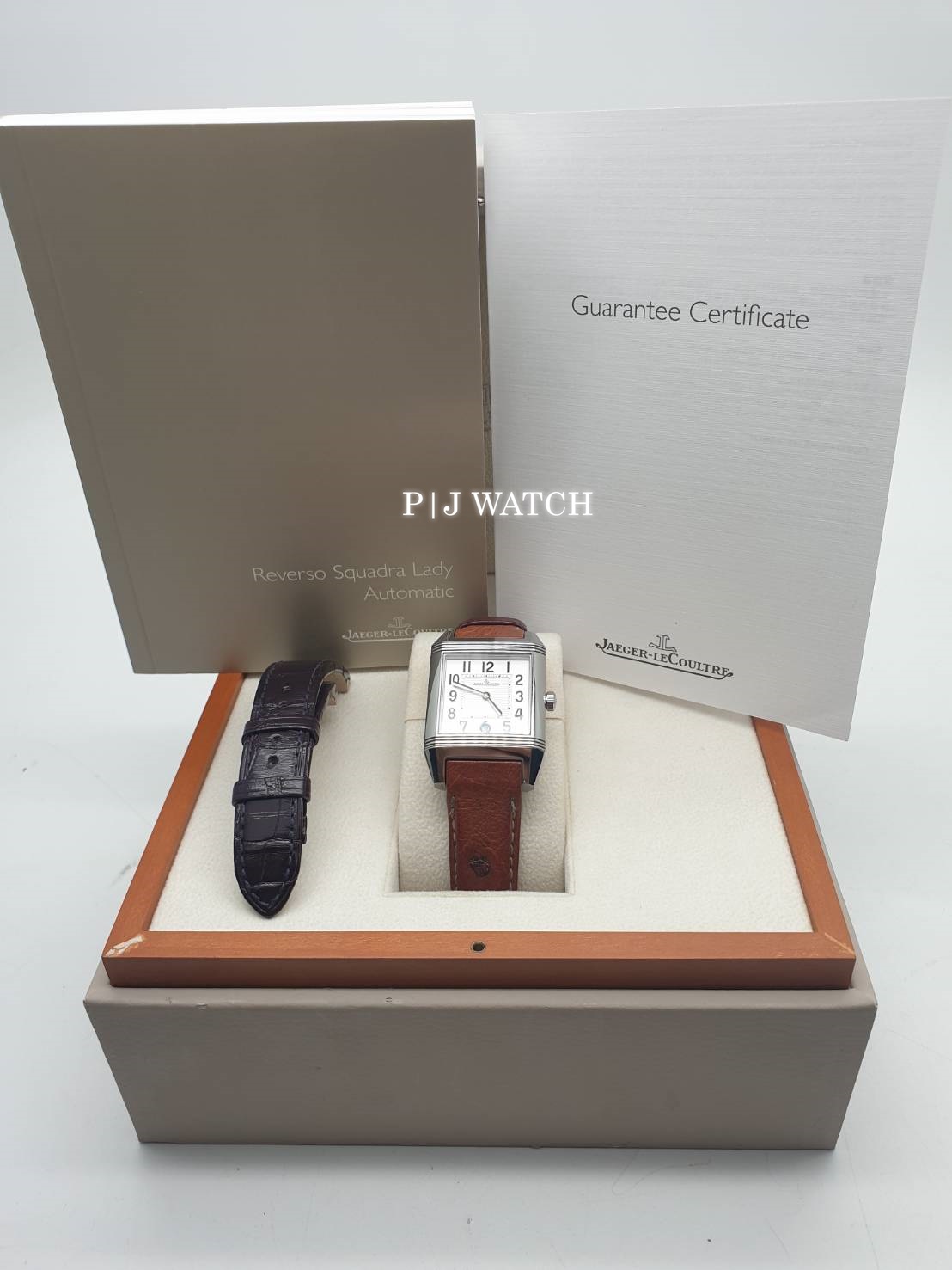 นาฬิกาแบรนด์ Jaeger-LeCoultre หรือ JLC มาในรุ่น Reverso Squadra Ref.234.8.66 เรือนนี้โดนเด่นด้วยการออกแบบเฉพาะของ JLC คือตัวเรือน สามารถเลื่อนสไลด์ไปด้านข้างแล้วพับให้โชว์เคสด้านหลังที่โชว์กลไกได้ หน้าปัดสีเงินขาว ตรงกลางเป็นลายหยักแนวนอน Fluted รูปสี่เหลี่ยมและขอบของลายหยักแสดงขีดของนาที หลักชั่วโมงเป็นเลขอารบิก และแสดงวันที่ตรงหัวของเลข 6 ตัวเคสวัสดุทำจากสแตนเลสสตีลมีขนาดสี่เหลี่ยมอยู่ที่ 28 x 42 มม. ความหนา 10 มม. กระจกใช้คริสตัลแซฟไฟร์กันรอยขีดข่วนได้เป็นอย่างดี ส่วนกลไกเป็น calibre JLC automatic 966 สายเป็นหนังสีน้ำตาล Buckle เป็น Jaeger LeCoultre flip clasp และแถมสายหนังจระเข้สีดำมาให้อีก 1 ชุดครับ มีกล่อง คู่มือ และใบรับรองมาให้ครับ สภาพสวยมากครับเรือนนี้ ท่านใดสนใจ สามารถสอบถามเข้ามาได้ครับ เรายินดีให้บริการทุกท่านครับผม