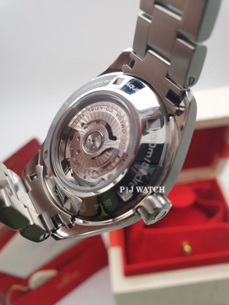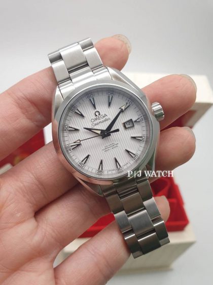 นาฬิกาแบรนด์เนม OMEGA กับตระกูล Seamaster รุ่น Aqua Terra 150M Ref.231.10.34.20.04.001 รูปแบบนาฬิกาคลาสสิกของตระกูล Seamaster กับหน้าปัดสีขาว ลาย Teak Concept ให้ความรู้สึกเหมือนพื้นเรือใบหรู Marker ชั่วโมงแบบขีดสามเหลียมสีเงินพร้อมพรายน้ำ และตรงวงนอกบอกสเกลนาที ตัวเคสเป็นสแตนเลสเกรด 316L ทนต่อการกัดกร่อนและมีความมันวาวที่ดีมาก มีขนาดอยู่ที่ 34มม. ด้านหลังโชว์กลไก ตัวเครื่องเป็นระบบไขลานอัตโนมัติ เครื่อง OMEGA Co-Axial caliber 8520 ให้พลังงานสำรองอยู่ที่ 50 ชั่วโมง ครอบด้วยกระจก sapphire ทั้งด้านหน้าและหลัง เม็ดมะยมเป็นแบบล็อกขันสกรู กันน้ำได้ 150 เมตร มาพร้อมกับสายเหล็กและชุดล็อคเป็นแบบบานพับมีปุ่มกด