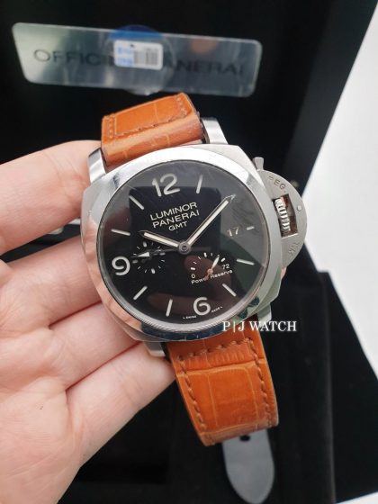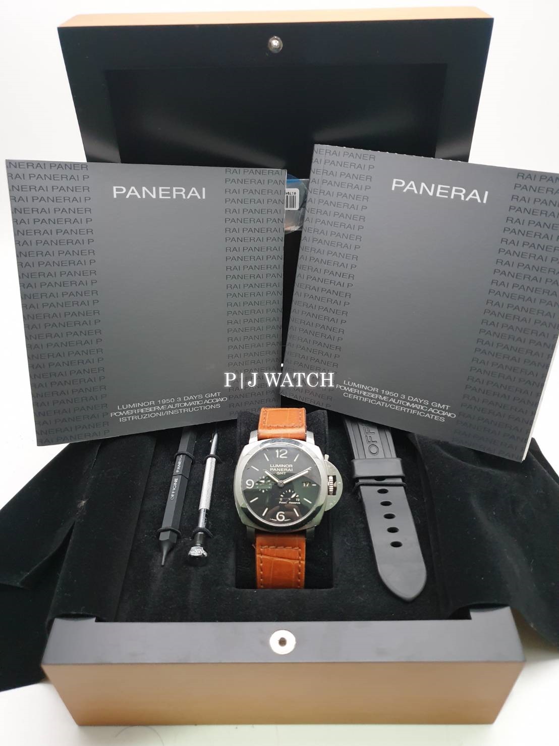 Panerai Luminor GMT Automatic Power Reserve 3 Days PAM 321 รุ่นนี้เป็น Q Series ครับ กับตัวเคสทรง Luminor เป็นสแตนเลสขนาดอยู่ที่ 44 มม. ความหนา 18 มม. หน้าปัดแซนวิส สีดำหลักชั่วโมงเป็นพรายน้ำ ทั้งแบบขีดและตัวเลขอารบิค 6 9 12 บนหน้าปัดมีเข็มบอกเวลาชั่วโมง – นาที – เข็ม GMT มีหน้าปัดย่อยแสดงเวลาวินาที ตรงข้างเลข 9 หน้าต่างช่องเล็กๆ ตรงตำแหน่ง 3 นาฬิกาแสดงวันที่ และส่วนตำแหน่งบน 5 นาฬิกาแสดงพลังานสำรอง 72 ชั่วโมง ด้านหลังโชว์กลไกครอบทับด้วยกระจก Sapphire ทั้งด้านหลังและหน้าด้านเป็นทรงโดม ส่วนตัวกลไกใช้เครื่อง P.9002 บรรจุ Jewels ทั้งหมด 29 ชิ้น สามารถกันน้ำได้อยู่ที่ 300 เมตร มาพร้อมกับสายหนังจระเข้สีน้ำตาลส้มและถามมีหนังยางซิลิโคนมาให้อีก 1 ชุด มีกล่อง เครื่องมือ คู่มือมาให้ครับผม สภาพตามการใช้งาน ไม่มีการขัดแต่งใดๆ ครับ ท่านใดสนใจสามารถติดต่อสอบถามเข้ามาได้เลยครับผม ยินดีให้บริการครับ