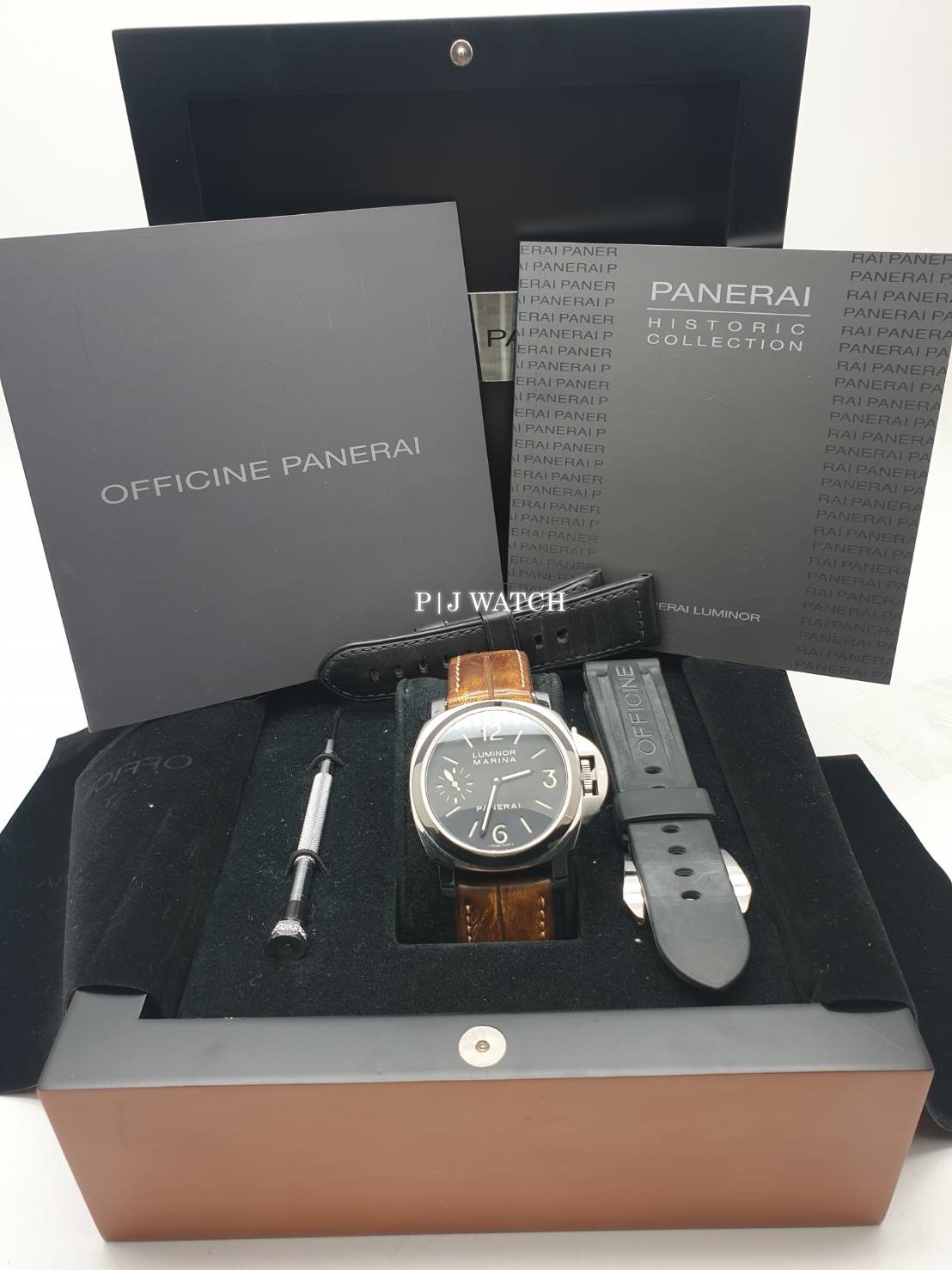 นาฬิกา Panerai ในตะกูล Luminor Marina รุ่น PAM 111 หน้าปัดสีดำ เคสเคส Luminor ทำจากสแตนเลสสตีลขัดเงาทั้งเรือน ตัวเรือนมีขนาด 44mm กระจกด้านหน้าและหลังเป็น Sapphire มีพลังงานสำรองอยู่ที่ 56 ชั่วโมง กันน้ำลึกได้ที่ 300เมตรครับ มาพร้อมกับสายหนังจระเข้ และสายยางสำรองอีก เส้นครับ มีกล้อง คู่มือ อุปกรณ์ ในสภาพสวยๆ ครับ