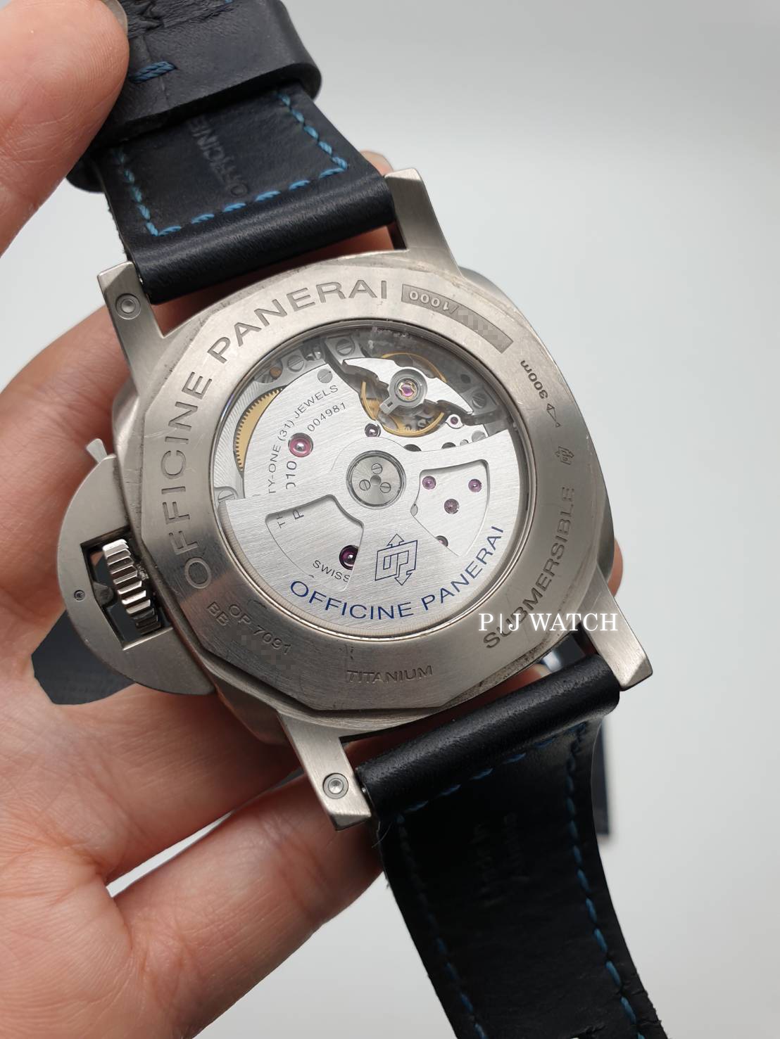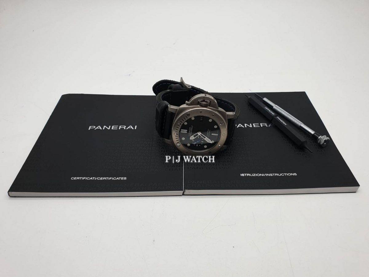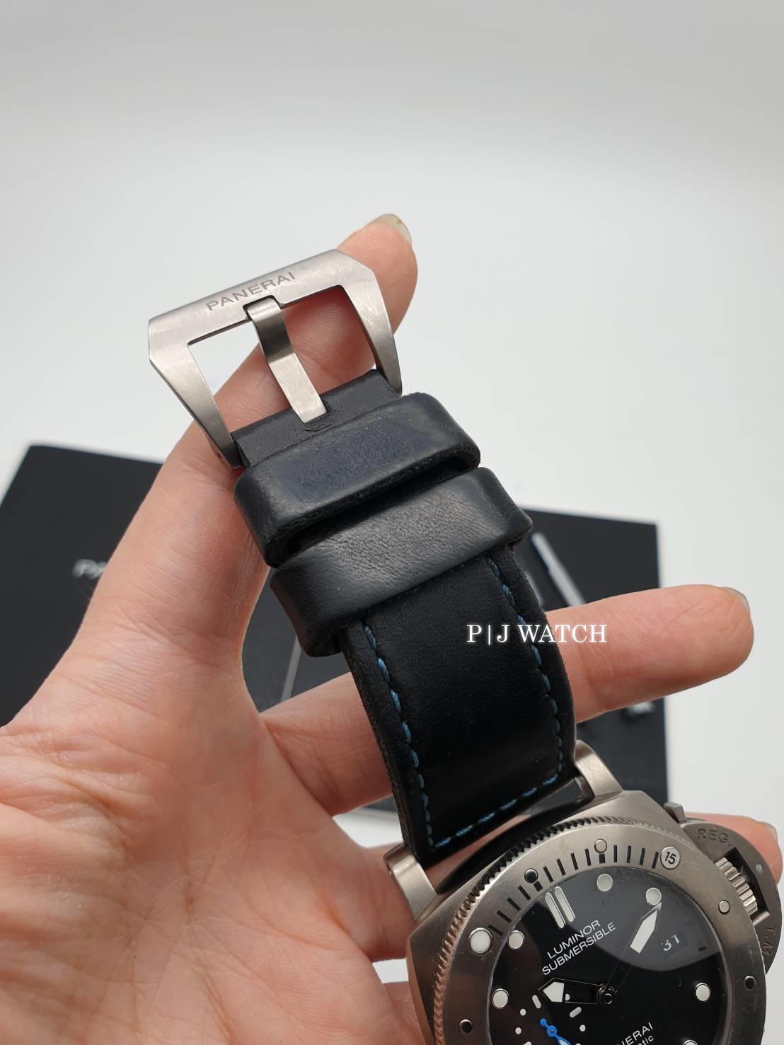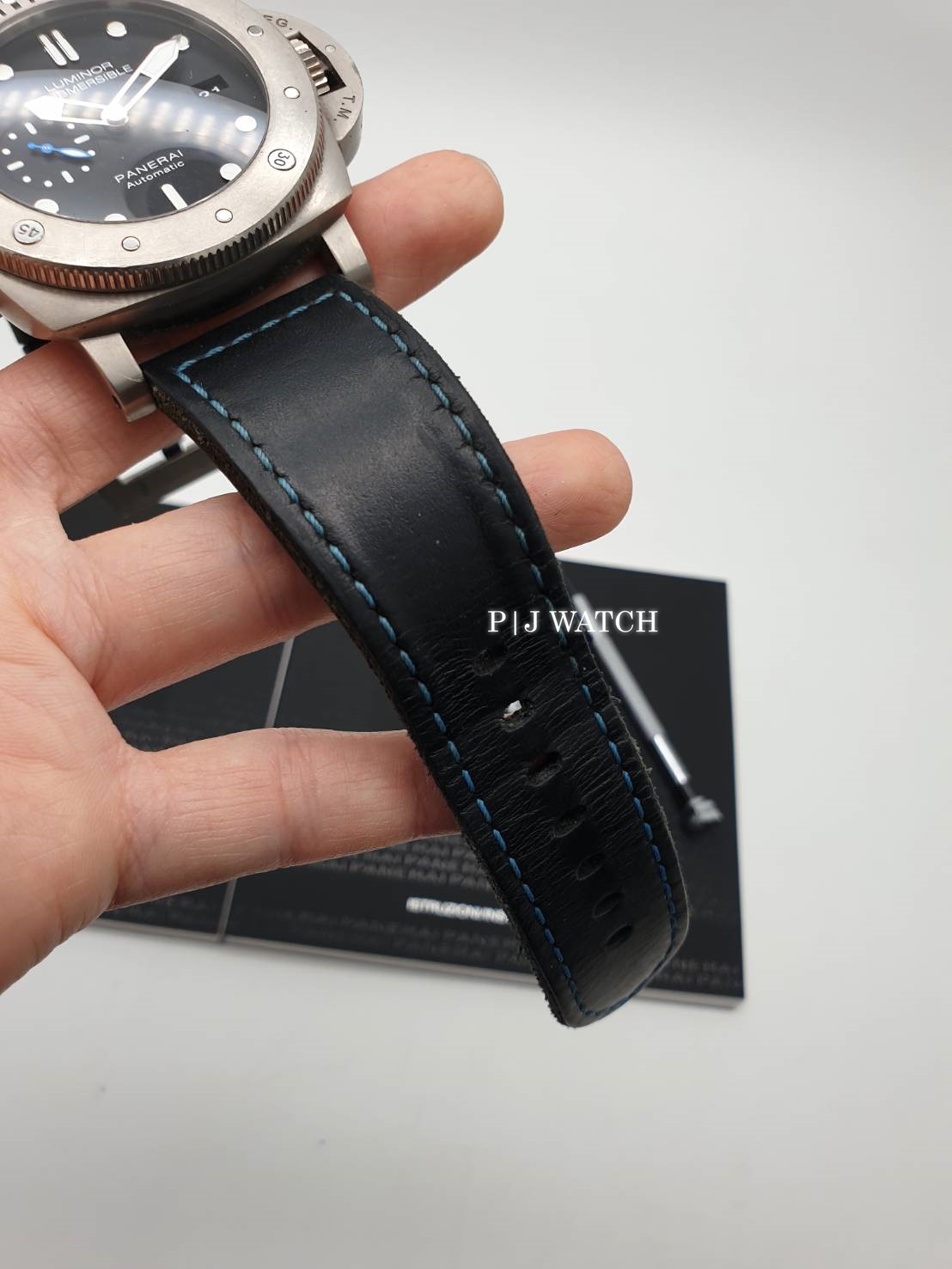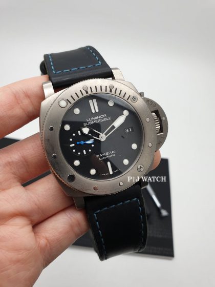 นาฬิกา Panerai Luminor Submersible 1950 3 Days หรือ PAM 1305 ตัวเรือนทำจากไทเทเนียมขัดเงาขนาด 47 mm ฝาหลังโชว์กลไก รุ่นนี้ใช้ระบบ automatic Chronometer (P.9010) หน้าปัดสีดำหลักชั่วโมงพรายน้ำทำจาก super luminova มีฟังก์ชั่นบอกวินาทีเข็มสีฟ้าตรงตำแหน่ง 9 นาฬิกา และแสดงวันที่ ที่ตำแหน่ง 3 นาฬิกา มาพร้อมกับสายหนังวัวเย็บด้วยด้ายสีฟ้า ชุดนี้มีคู่มือ และอุปกรณ์มาให้ครับ