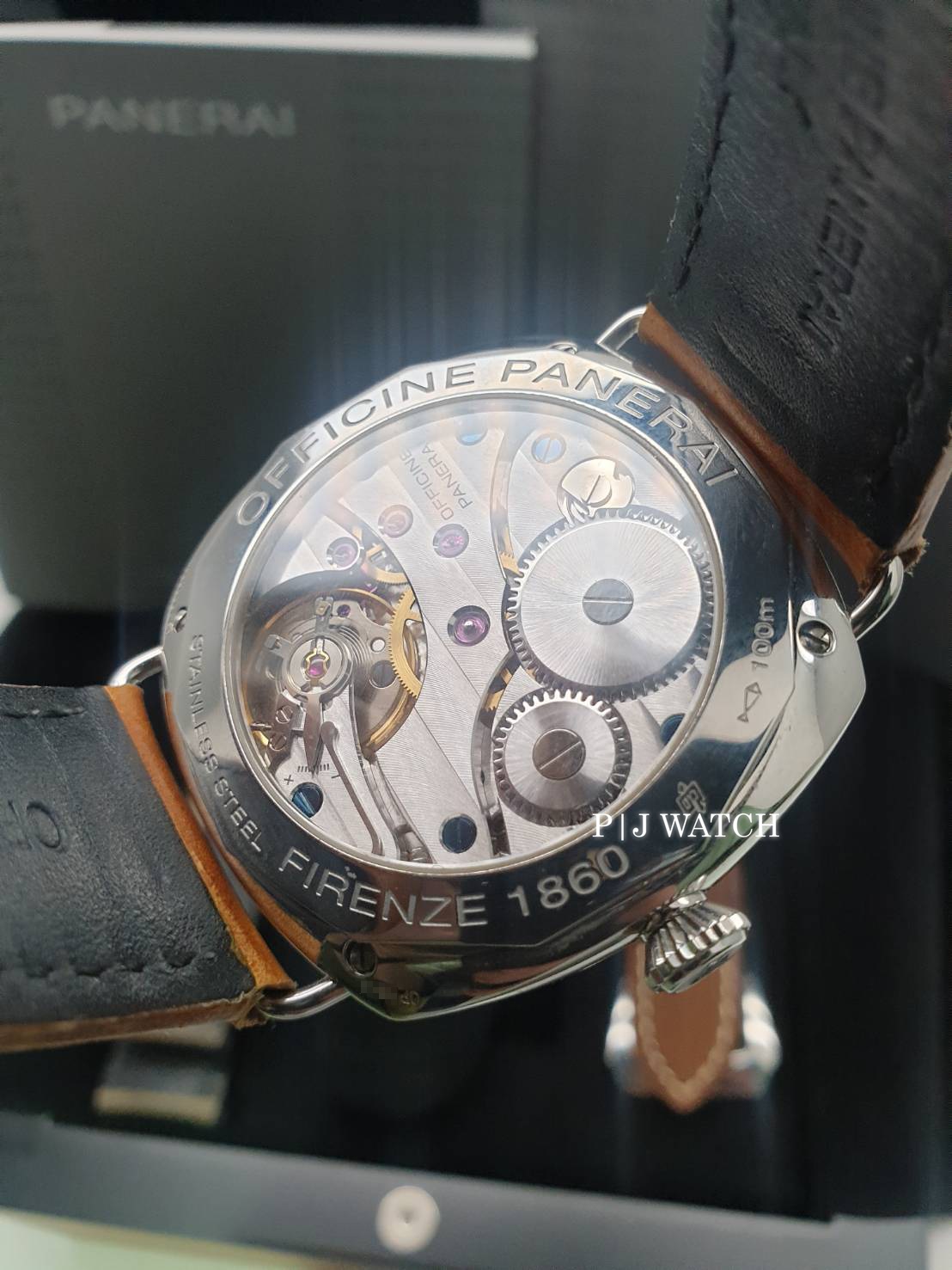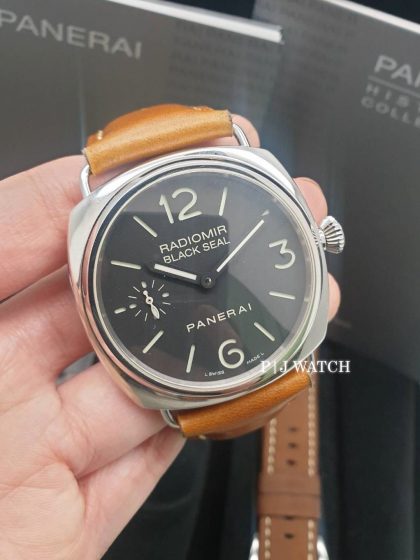 นาฬิกา Panerai Radiomir Black Seal Pam 183 เป็นรุ่นยอดฮิตอีกเรือน ตัวเรือนเป็นทรงสี่เหลี่ยมโค้งมนขนาดใหญ่ ทำจากสแตนเลสเกรด 316L ปัดเงาทั้งเรือน ความกว้างตัวเรือน 45 มม. หน้าปัดสีดำแบบแซนวิส “Sandwich Dial” มาร์คเกอร์ชั่วโมงเป็นพลายน้ำ Super Luminova เห็นชัดเจนมากๆ ในตอนมืด ส่วนเข็มบอกชั่วโมงนาที เป็นสีดำพร้อมพรายน้ำ ส่วนเข็มบอกเวลาวินาที ถูกแยกเป็นอีกหน้าปัดตรงตำแหน่ง 9 นาฬิกา ด้านหลังโชว์เปลือยโชว์กลไก ครอบทับด้วยกระจก Sapphire ด้านหลังและด้านหน้าเป็นทรงโดม สามารถกันน้ำได้อยู่ที่ 100 เมตร เม็ดมะยม แบบ Screw in Crown ด้านตัวเครื่องใช้เครื่อง OP Cal XI มี 17 Jewlels รุ่นนี้กลไกเป็นแบบไขลานด้วยมือ ให้ความถี่ที่ 21,600 bph ให้พลังงานสำรองอยู่ที่ 56 ชม. มาพร้อมกับหนังวัวสีน้ำตาลมีทั้งหมด 3 สีให้เลือก เบื่อสสีไหนเปลี่ยนตามใจชอบได้เลยครับคุ้มมากๆ มีกล่อง ฝาครอบ คู่มือมาให้ครับ สภาพสวยงามมากๆ เรียกได้ว่าเก็บรักษามาอย่างดี ท่านใดที่กำลังมองหา PAM รุ่นนี้อยู่ไม่ผิดหวังแน่นอนครับเรือนนี้