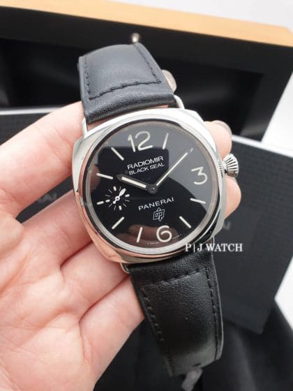 นาฬิกาแบรนด์ Panerai รุ่น Radiomir Black Seal – PAM 380 หน้าปัดสีดำ หลักชั่วโมงแบบเพ็นท์เรืองแสง มีวินาทีแยกเป็นหน้าปัดย่อย ตรงตำแหน่ง 9 นาฬิกา เม็ดมะยมเป็นแบบล็อกขันเกลียว เคสเป็นสแตนเลส ขนาด 45มม. รุ่นนี้เครื่องไขลาน ทรงคลาสสิคอีกรุ่นที่แนะนำครับ มากับสายหนังสีดำเดินด้ายดำ buckle แบบเข็มขัด สภาพสวยครับเรือนนี้ มีกล่อง อุปกรณ์ คู่มือ ใบรับประกัน แบบ Full Set ครับ ท่านใดสนใจ ติดต่อสอบถามเข้ามาได้เลยครับ เรายินดีให้คำแนะนำและบริการเต็มที่ครับ