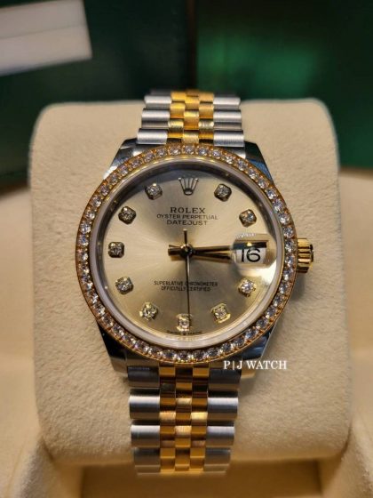 | Bezel material/วัสดุขอบหน้าปัด | ขอบ Yellow Gold 18K ประดับเพชรเต็มวงจากโรงงาน |