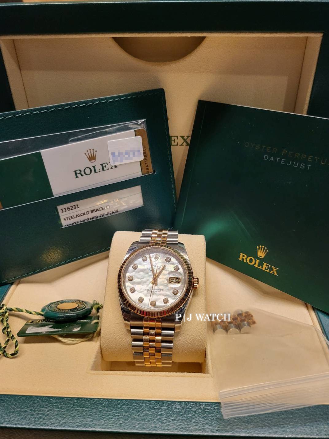 | Accessories/Certification/อุปกรณ์เสริมและใบรับรอง | กล่อง, คู่มือ, ใบรับประกัน ,ข้อต่อสายจูบิลี่ ทูโทน ป้ายรับรอง COSC |