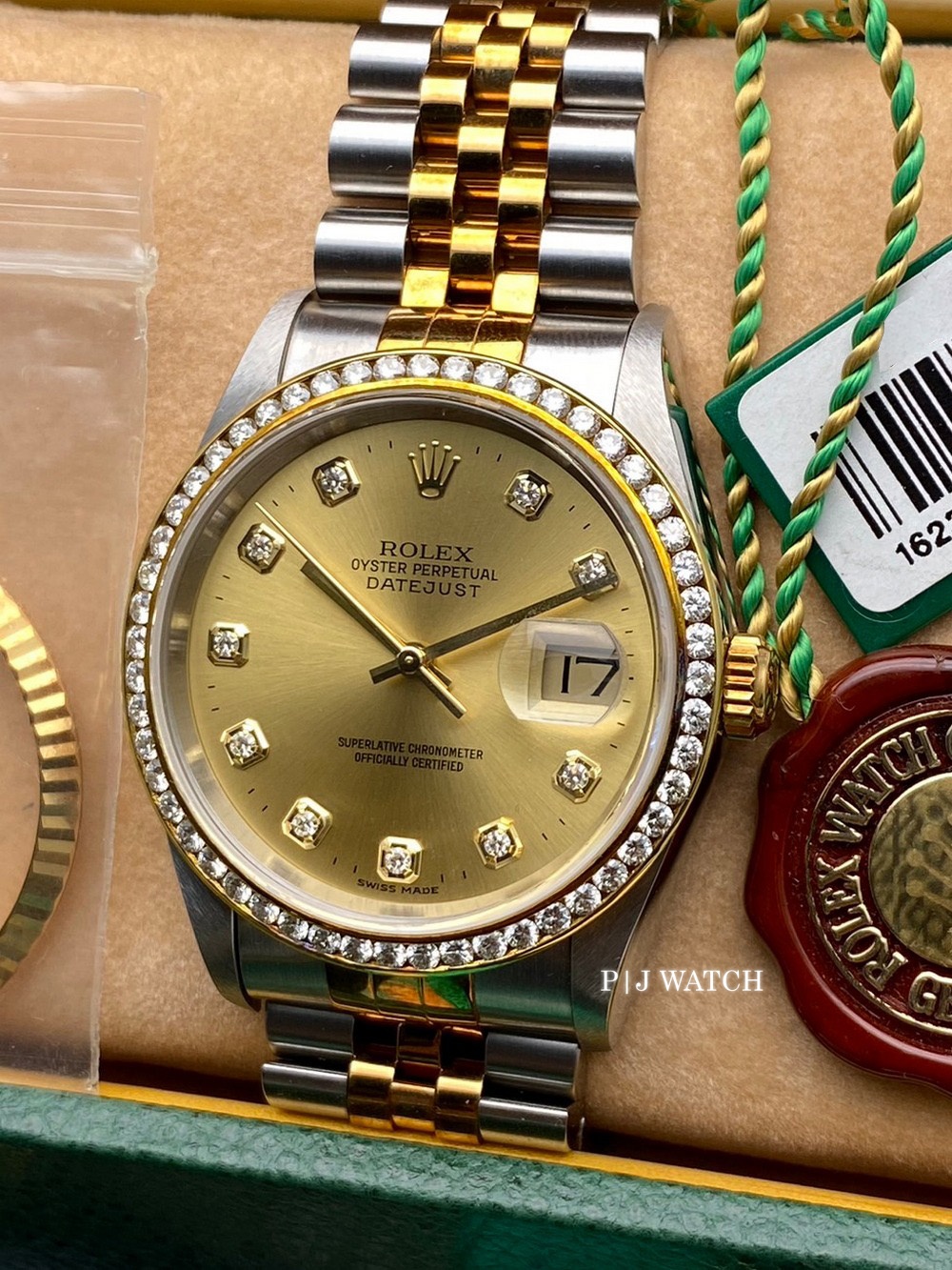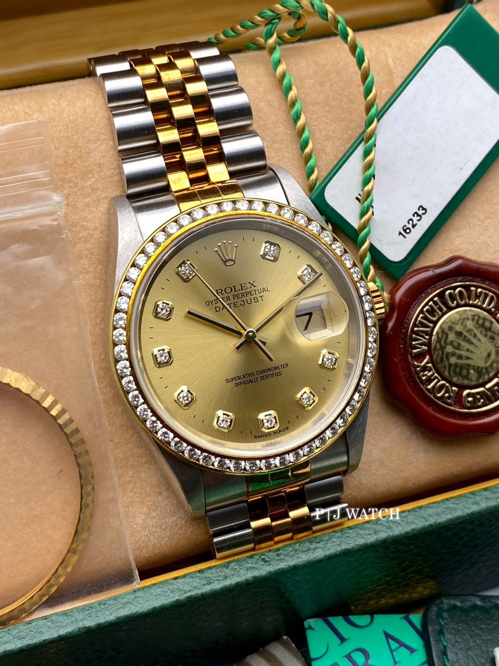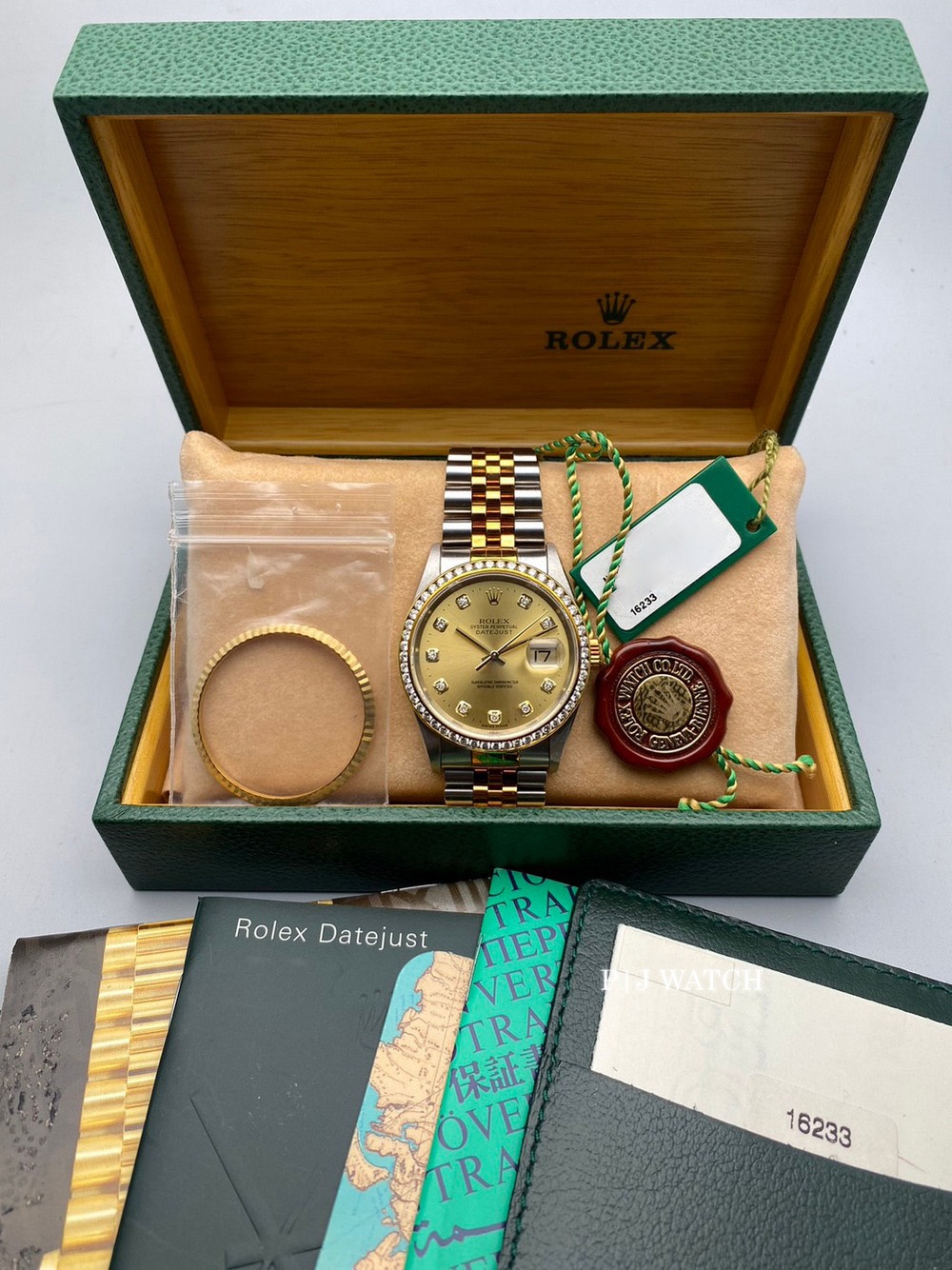 | Accessories/Certification/อุปกรณ์เสริมและใบรับรอง | กล่อง คู่มือ ใบรับประกัน ป้าย COSC ขอบ bezel ลาย fluted ของเดิมจากโรงงาน 1 วง |