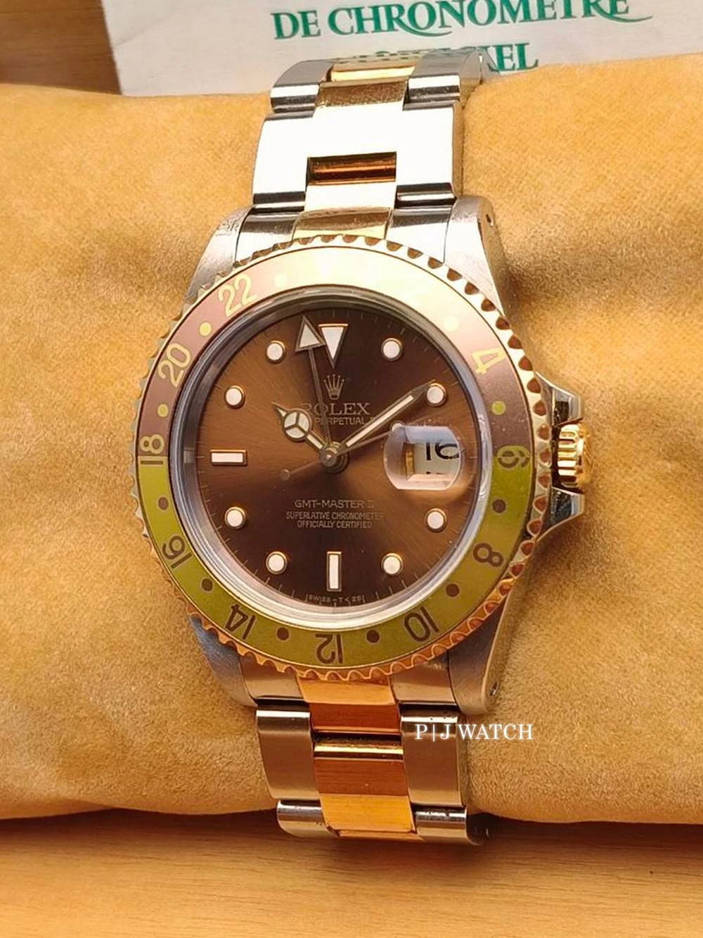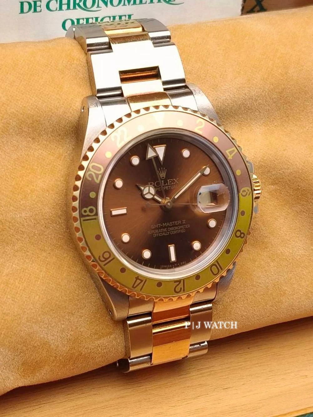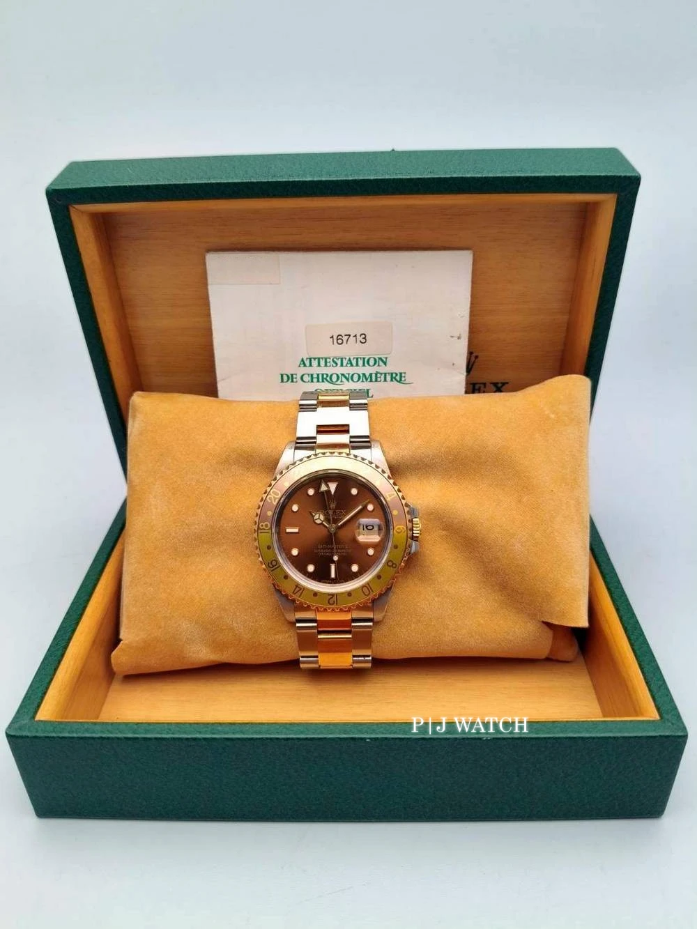 | Bezel material/วัสดุขอบหน้าปัด | ขอบ Yellow Gold 18K ครอบด้วย Cerachrom ทำสีรูทเบียร์ พิมพ์เลข 24 ชั่วโมง |