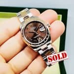 เรือนนี้ไม่ต้องเอ่ยบรรยายอะไรมากมาย ถือว่าเป็น Rolex ที่คุณสาวๆถามถึงกันมากที่สุดใน พ.ศ นี้ ของมือสองไม่ค่อยมีมาให้เห็นกันบ่อยๆมีมาก็อยู่ได้ไม่นาน ความนิยมสูงสุด ในหมู่คุณสาวๆ ในยุคนี้เลยก็ว่าได้ครับ ด้วยขนาดที่ได้รับความนิยมสูงสุด คือ 31 mm กำลังพอเหมาะไม่ใหญ่หรือเล็กจนเกินไป สายแบบ Oyster (เต้าหู้) ดูออกแนว Sport แลดูลงตัว กับ หน้าปัด สีน้ำตาล Chocolate (สีหน้าปัดใหม่) และ มีเพชรแอบแซมให้ดูมีกิมมิคมากขึ้นลงตัวมากขึ้น ที่ ตำแหน่ง 6 นาฬิกา เป็นเลขโรมัน VI ถือเป็น Design ใหม่ จาก Rolex และนอกจากนี้ สี Chocolate ยังดูเข้ากับ สีของทอง Pink gold ของสาย และ ขอบเพชรกระจาย ที่กำลังนิยมมากๆใน ขณะนี้ครับ ด้วยการดีไซน์ของเพชรที่ลงตัว ที่ Design แบบ “การกระจาย” ดูสวยงามร่วมสมัย ไม่เยอะไม่น้อยจนเกินไป ใส่ได้ทุกวัย จนเรียกรุ่นนี้กันติดปากว่า “ขอบ เพชรกระจาย” จนถือว่าเป็น Signature ของรุ่นนี้ไปโดยปริยายเลยก็ว่าได้ครับ ภาพโดยรวม ดูโดดเด่นสวยงามลงตัวสุดๆในทุกมุมมอง ใส่ไปไหนก็มีแต่คนชม แน่นอนครับ เรือนนี้มาพร้อมกับ อุปกรณ์ ครบๆ แบบ Full set ตามภาพเลยครับ ทั้ง กล่อง+ใบรับประกันลงปี 11/2014 คู่มือ ซองหนัง ครบๆเหมือนถอยใหม่ป้ายแดง
