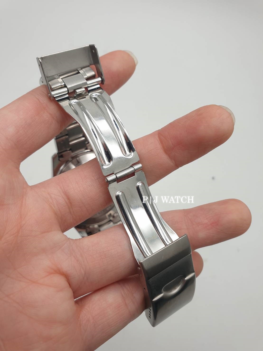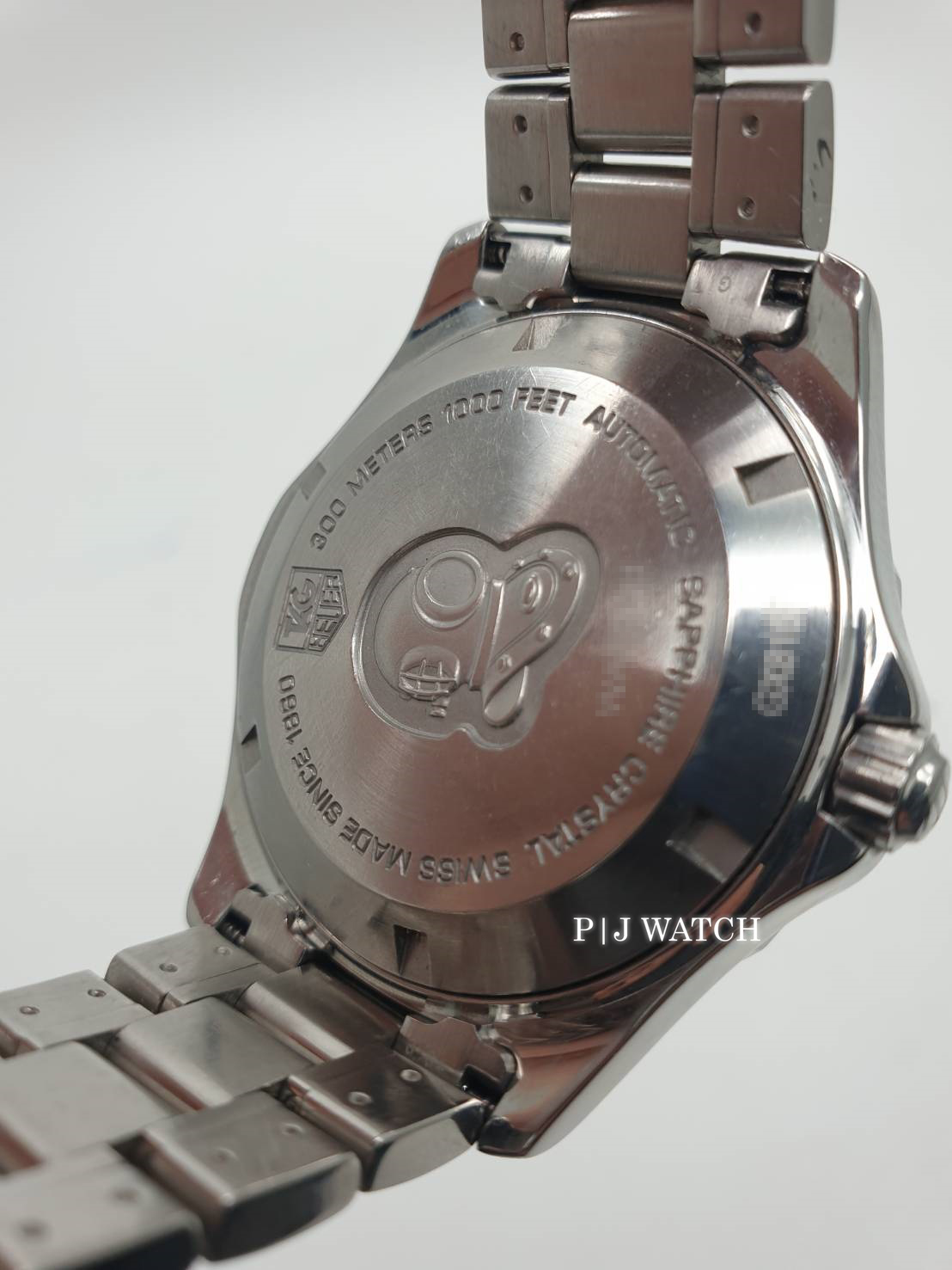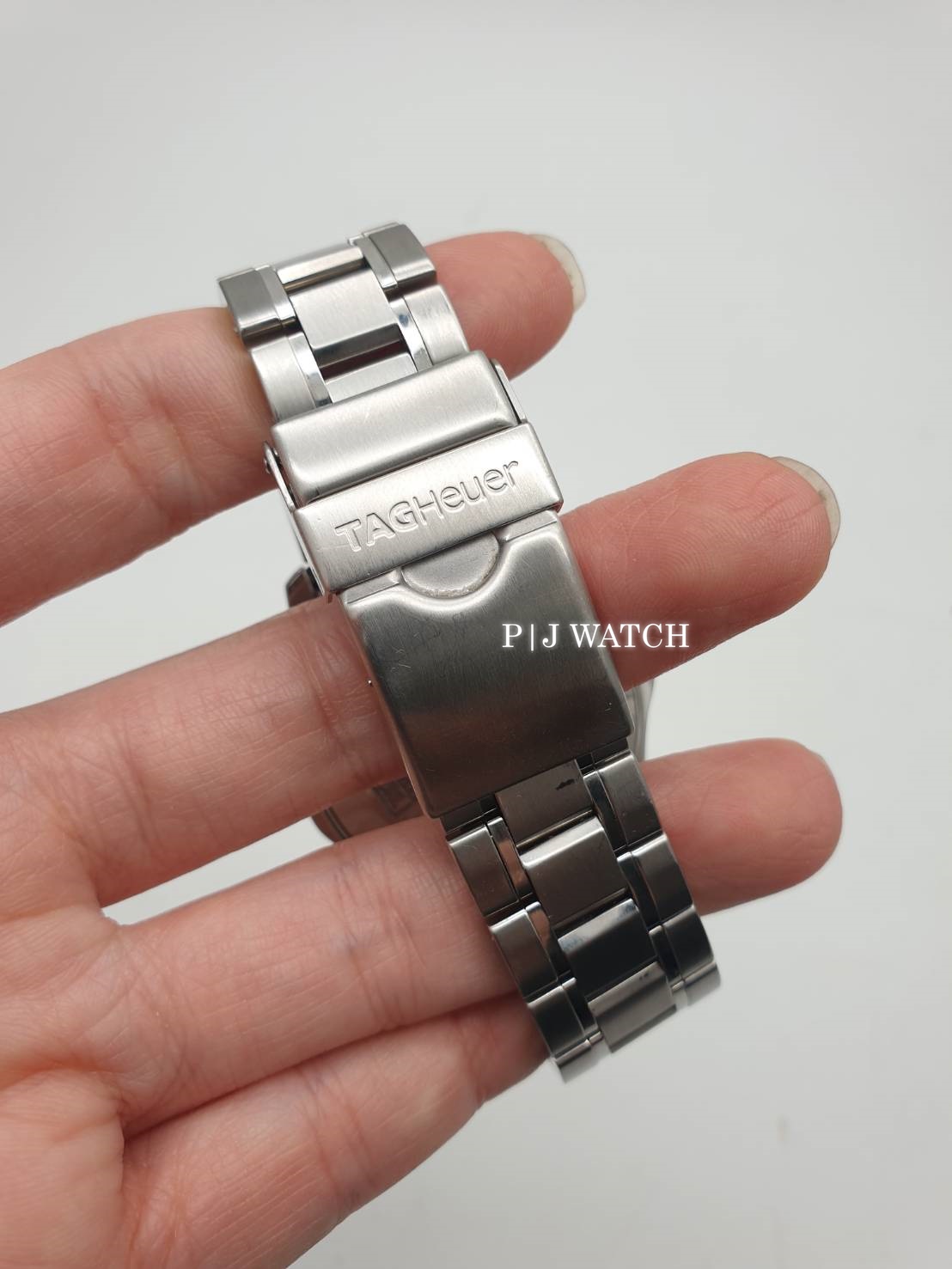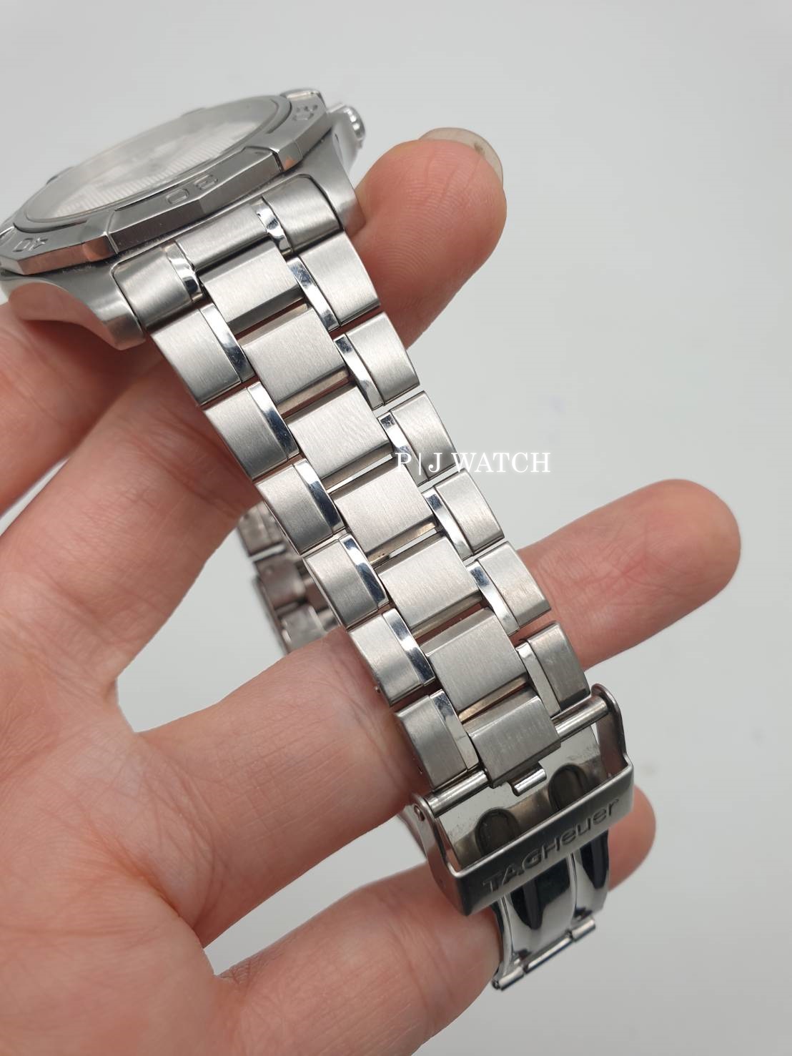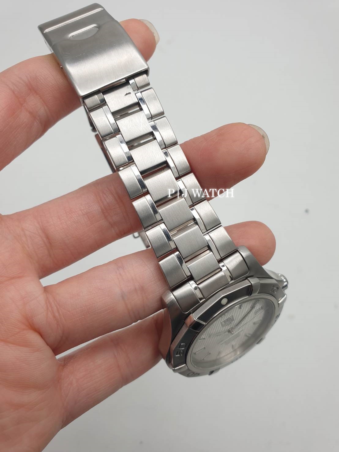 นาฬิกา TAG Heuer รุ่น Aquaracer Ref.WAF2111.BA0806 เป็นนาฬิกาตระกูลดำน้ำอีกเรือน กับหน้าปัดสีขาวเงินลายตาราง หลักชั่วโมงแบบขีดสีเงินมีพรายน้ำ Superluminova และขอบหน้าปัดวงนอกมีสเกลบอกนาที และบอกวันที่ตรงตำแหน่ง 3 นาฬิกา ส่วนตรง Bezel เป็น Steel มีหลักพรายน้ำตรงตำแหน่ง 12 นาฬิกา มีขีดแบบนูนและตัวเลขอารบิก ขอบหน้าปัดสามารถหมุนได้ เม็ดมะยมเป็นแบบล็อคขันเกลียว ด้านหลังเคสแกะสลักเป็นรูปหมวกสำหรับนักดำน้ำสมัยก่อน ตัวเคสมีขนาดอยู่ที่ 38.4 mm รุ่นนี้เป็นนาฬิการะบบไขลานอัตโนมัติ ใช้เครื่อง Calibre 5 ให้พลังงานสำรองอยู่ที่ 42 ชั่วโมง กระจกใช้แซฟไฟร์ป้องกันรอยขีดข่วน กันน้ำได้ลึกอยู่ที่ 300 เมตร มาพร้อมกับสายเหล็กของ TAG Heuer ชุดล็อคแบบบานพับและมีตัวล็อคบานพับอีก 1 ชั้น สภาพเดิมๆ ครับเรือนนี้ ไม่เคยผ่านการขัดแต่งใดๆ ท่านใดกำลังมองหา สามารถสอบถามหาเราได้ทันทีครับ ยินดีให้บริการทุกท่านครับ